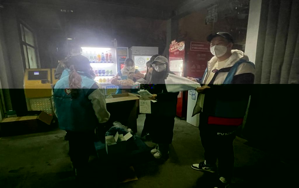 聞令而動,保障到位。黨員先鋒隊承擔着樓内原地靜默學生的一日三餐配送工作。由于涉疫學生人數動态變化,送餐數量和樓層等信息需等到送餐時間臨近才能确定。加上穿脫防護服程序繁瑣,耗時較長,因此送餐前需要提前半個小時準備。時間緊,流程多,隻要接到消息,隊員們都會第一時間放下手中工作,穿防護服、到指定地點領取食物、送到指定樓層發放、處理防護服,順利完成配送任務。負責送餐的隊員穿上防護服後從頭到腳全身都被裹得嚴嚴實實,密不透風。寶源公寓樓層較高,電梯少,送餐時正值學生上下樓高峰,為了讓被保障的同學們吃上熱飯菜,他們就經常穿着防護服走樓梯以節省時間,每次送餐途中全身就濕透了。即使如此,黨員先鋒隊成員沒有一個中途退出的。